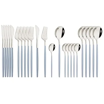 Show moreIntroducing the JASHII Flatware Set – a perfect combination of style, elegance, and functionality. This stunning 24-piece set is crafted from premium 18/10 stainless steel, ensuring exceptional durability and resistance to corrosion and high temperatures. The beautiful haze blue and silver tone elevates your dining experience, making it ideal for any occasion including holiday dinners, casual gatherings, or a sophisticated dinner party. Enjoy both practical usage and aesthetic appeal in your tableware! This set is dishwasher safe, making cleanup a breeze after every delightful meal.