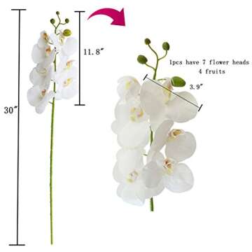 Show more Transform your space with our stunning artificial phalaenopsis orchids, a captivating blend of nature and artistry. Each branch boasts 7 meticulously crafted flowers and 4 vibrant fruits, making them an eye-catching addition to any decor. With a total length of 30 inches and a flower head diameter of 3.9 inches, these authentic-looking orchids are made from PU real touch material, ensuring they feel as luscious as they look. Unlike traditional silk flowers, our orchids are poison-less and harmless, making them a safe choice for homes with children and pets.