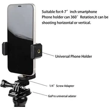 Show more If you're looking for the ultimate smartphone and action camera mount, look no further than this innovative flex clamp mount. This device is engineered to provide an exceptional filming experience, boasting compatibility with a wide variety of devices from iPhones to all series of GoPro cameras, including Google Pixel and Akaso models. Whether you're filming your son's Little League games or capturing epic moments while riding your unicycle, this mount is designed to accommodate smartphones ranging from 4 to 7 inches, and can also secure your action camera with unrivaled stability.
