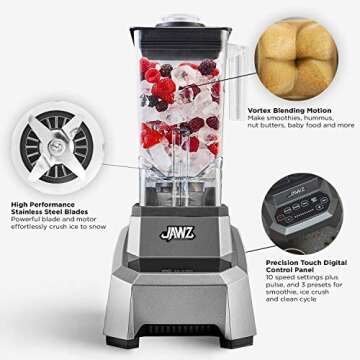 JAWZ High Performance Blender, 64 Oz Professional Grade Countertop Blender, Juicer, Smoothie or Nut Butter Maker, Precision Smart Touch Variable Speed, Stainless Steel Blades, Silver
