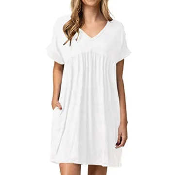 Jayscreate Women's Baby Doll Dress Summer Casual Tunic Pleated Flowy Swing Short Sleeve White V Neck Mini Dress with Pockets Loose Fit