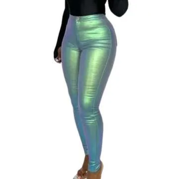 Jaytep Womens Holographic Skinny Metallic Pants Stretch Fashion Casual Disco Metallic Jean Shorts (as1, Alpha, m, Regular, Regular, Green)