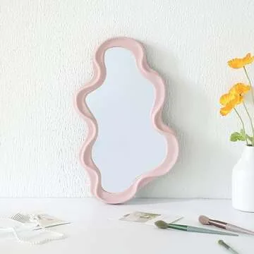 Show more Introducing the JDPEYI Funky Wavy Mirror, an exquisite piece that beautifully combines art and practicality. Whether you wish to elevate your bedroom aesthetics, create a whimsical film set, or simply accentuate a bare wall, this 16" x 10" pink irregular wall hanging mirror is designed to steal the spotlight. Its playful wavy shape offers a refreshing twist to traditional mirrors, allowing it to not just serve a reflection but also act as a vibrant statement piece in any room. Crafted from high-quality ABS material and featuring high-definition reflective glass, this mirror guarantees both durability and clarity, making it a reliable choice for everyday use.