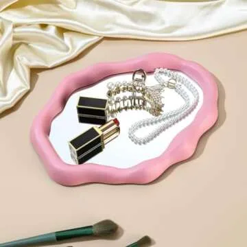 The unique wavy design not only provides a perfect reflection for your makeup needs but also serves as a decorative accent in your home. The frame ingeniously allows for storage of your precious jewelry and skincare products, making it an essential item for any beauty lover. Whether you're getting ready for a night out or simply need to check your look, this mirror has you covered.