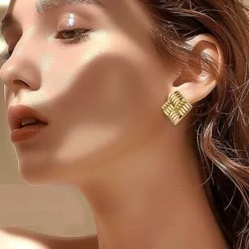 Show more Introducing the ultimate accessory that is perfect for all occasions—the stunning Big Chunky Gold Square Stud Earrings! These unique earrings feature a vintage and timeless design, showcasing a striped grid and textured rectangle that adds a sophisticated touch to any ensemble. Crafted from 18k gold plated stainless steel, these earrings are not only elegant but also incredibly durable. Their fade-resistant properties ensure that they maintain their charm over time, while being hypoallergenic guarantees comfort for those with sensitive skin.