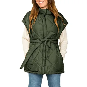 Jeanewpole1 Women's Padded Puffy Vest Stand Collar Sleeveless Zip Gilet with Belt
