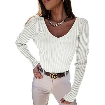 Jeanewpole1 Women's V Neck Knit Slim Fit Sweater - Effortless Elegance in White