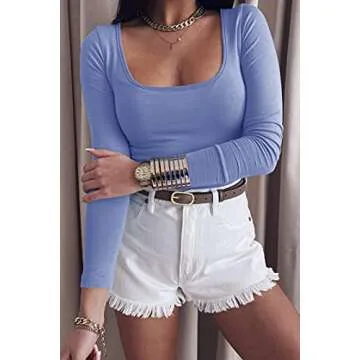 Jeanewpole1 Womens Square Neck Long Sleeve T-Shirt Basic Slim Fitted Solid Tops