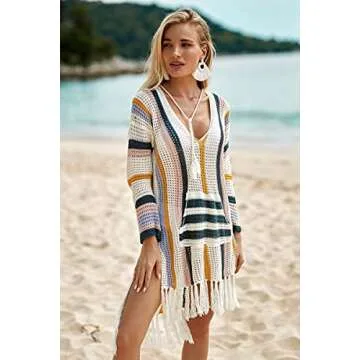 Show moreIntroducing the ultimate beach companion, the Stylish Crochet Swimsuit Cover-Up! Crafted with high-quality, soft fabric, this cover-up not only provides comfort but also ensures you look stunning while enjoying the sun. With its chic v-neck drawstring design, it perfectly melds elegance with a playful twist. The adorable tassels along the hem add a touch of whimsy, making this piece truly unique.