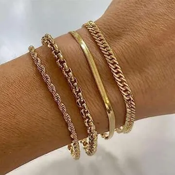 Show more The exquisite 4 Pcs Gold Bracelets Set is a stunning collection that enhances every outfit with a touch of elegance. Each set includes a variety of chains: a sleek Snake chain, a classic Twisted rope chain, a bold Cuban Chain, and a secure Locking Chain. These versatile bracelets are designed for layering, allowing you to express your personal style effortlessly.