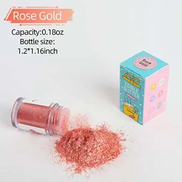 Show more Introducing a delightful culinary accessory that brings the sparkle and shine to your desserts – the premium edibles glitter dust! With six stunning colors to choose from—including Rose Gold, Gold, Silver, Pink, Clear White Diamond, and Purple—this product is perfect for any occasion. Each jar contains 5 grams of high-quality, food-grade mica powder imported from Germany, ensuring your creations will look as amazing as they taste.