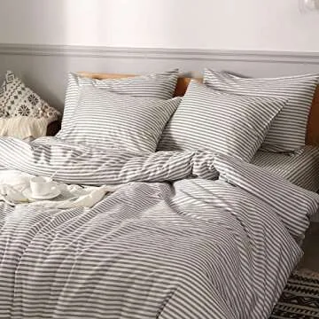 Show moreIntroducing the JELLYMONI Duvet Cover Set, crafted meticulously from 100% natural cotton to provide a perfect blend of comfort and style. This luxurious duvet cover features a stylish white background accented with elegant grey stripes, making it a versatile addition to any bedroom decor. Designed with a convenient hidden zipper closure and practical corner ties, this cover ensures that your duvet insert stays securely in place, giving you uninterrupted sleep and a beautifully maintained look. Measuring at a generous 98x98 inches for the duvet cover and 20x26 inches for pillowcases, this set is ideal for those seeking quality bedding that combines functionality and aesthetics.