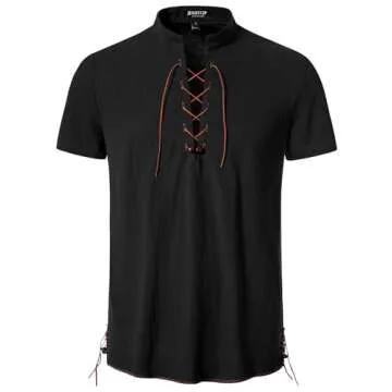 Show more Embark on an adventure into the past with the JEMITOP Men's Retro Renaissance Costume Short Sleeve Lace Up Shirt, meticulously crafted for those who appreciate historic style and fashion. Designed for spirited individuals, this black shirt features a striking contrast color drawstring adorned with two vintage beads, perfectly reflecting the essence of pirate, Viking, or medieval themes. The mandarin collar adds a unique twist, while the short sleeves provide comfort and ease of movement. This regular fit shirt is made from 100% cotton, offering breathability and a soft touch that ensures you feel great even during the most spirited performances or events.