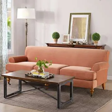 Why You Will Love This Product: Imagine sinking into the plush cushions of the Alana Lawson sofa after a long day, enveloped in its beautiful peach orange velvet fabric. The ambiance it creates not only enhances your living decorating scheme but also offers a comforting retreat for you and your loved ones. It's not just furniture; it’s an experience of luxury, style, and heartfelt coziness that invites connection and relaxation in your space.