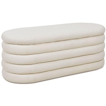 Show moreIntroducing the Jennifer Taylor Home Fuji 49" Modern Scandinavian Bedroom Entryway Upholstered Boucle Large Storage Bench, a perfect fusion of style and practicality for the modern home. This exquisite storage bench is crafted for those who appreciate the beauty of Mid-Century Modern design, featuring lovely boucle upholstery that mimics the soft look of sheepskin, providing a luxurious texture that elevates any space. Its **49-inch long** oval shape makes it an impressive accent piece that is not only visually appealing but also functional, offering a hinged lid that opens to reveal a spacious hidden storage compartment. This versatile bench blends seamlessly into various environments, be it in the entryway to greet guests or in the bedroom for added charm and storage solutions. Plus, it arrives fully assembled, so you can enjoy its beauty without the hassle of setup.