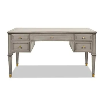 Show moreTransform your workspace into a haven of elegance and functionality with this stunning home office desk. Crafted from kiln-dried solid Rubber hardwood and expertly laminated wood veneer on MDF, this desk promises exceptional durability and a captivating aesthetic that elevates any room's decor. The five soft-close drawers on sturdy metal slides offer ample storage space, allowing you to keep your office essentials elegantly organized. You’ll appreciate the satin-gold tone drawer pulls that not only provide a modern touch but also harmoniously complement the hand-painted accents on the legs, bringing an added layer of sophistication to its design.
