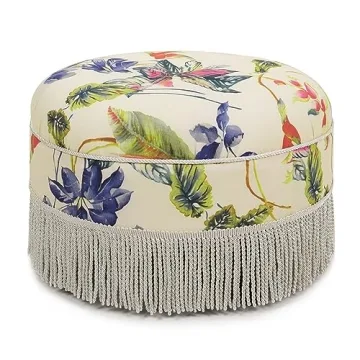The luxurious velvet upholstery in a sophisticated off-white and floral pattern adds a touch of charm and warmth to any space. Wrapped around premium high-density flame-retardant foam, this ottoman provides a delightful medium-firm feel, ensuring both comfort and support whether you're using it as extra seating or a comfortable footrest. The refined tassel rope bullion fringe beautifully accents its vintage-inspired design, enriching the aesthetic appeal and elevating your interior style.
