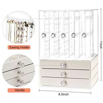 Jenseits Acrylic Jewelry Holder, Clear Earring Organizer with 3 Drawers, Velvet Hanging Jewelry Stand Storage for Necklace Earrings Ring Bracelet Display Case Gift for Women, Girls, Beige