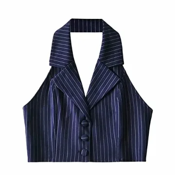 Jeovuanun Womens Pinstripe Button Down Halterneck Waistcoat Cropped Versatile Tuxedo Suit Vest