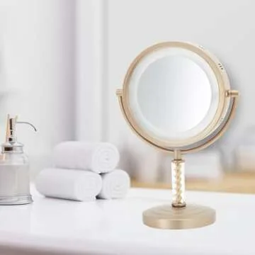 Show more This elegant tabletop vanity mirror seamlessly blends function with modern aesthetics, becoming a stunning centerpiece on any vanity or bathroom counter. The mirror boasts a sleek circular design with a premium brass finish, ensuring it complements a variety of home styles and decor. Perfect for those who take their grooming routine seriously, this mirror provides essential support while applying makeup or styling hair.