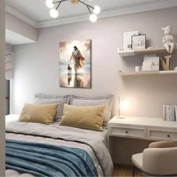 Show more Transform your living space with the striking Jesus Walks on Water Canvas Wall Art, a touching representation of divine guidance and love. This beautifully crafted artwork measures 12x16 inches (30x40 cm) and arrives stretched on a solid wooden frame, making it ready to hang right out of the box with included hooks and nails. Perfectly blending aesthetics and spirituality, this canvas art captures the moment when Jesus leads the lost lamb over tumultuous waters, a testament to His abiding care for all of us. Elevate your home decor while infusing your environment with inspiring faith and hope.