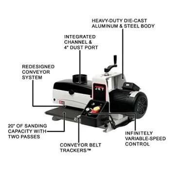 The JWDS-1020 boasts an open-ended design that allows for an impressive sanding capacity of up to 20 inches with just two passes, making it ideal for a variety of wood sizes. A built-in control system with an integrated circuit breaker protects the motor from overheating, ensuring the longevity and reliability of the tool.