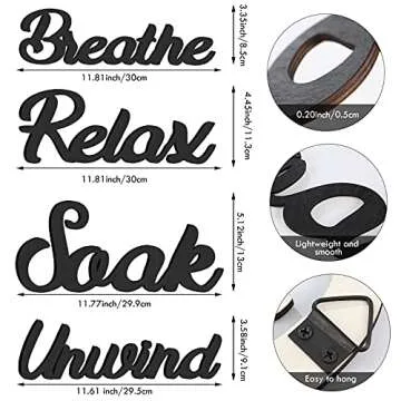 Jetec 4 Pcs Farmhouse Bathroom Wall Decors Relax Soak Unwind Breathe Wooden Word Sign Hanging Decorative Cutout Word Sign Rustic Primitive Wall Arts Vintage Wooden Decorations (Black)
