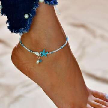 JEWEKY Boho Starfish Anklets Blue Ankle Bracelets Pearl Anklet Chain Beach Foot Jewelry for Women