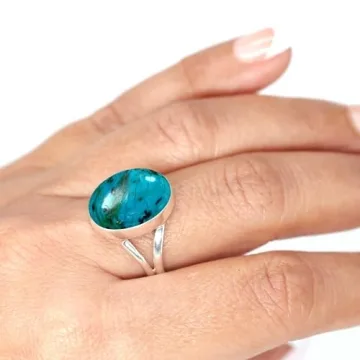 Show more Introducing the exquisite JEWELOPORIUM Blue Chrysocolla Silver Ring, crafted with love and precision from genuine 925 sterling silver. This ring is a stunning piece of fashion jewelry, gracefully showcasing a real blue chrysocolla gemstone, beautifully cut into an oval shape measuring 12x16 mm. The captivating hues of blue and green in the chrysocolla make each ring unique, reflecting light and elegance from every angle. Featuring a smooth, comfortable design without any sharp edges, this ring not only makes a bold statement but also ensures a snug fit for everyday wear. Designed to last, it is marked with a .925 stamp guaranteeing its silver authenticity, and is anti-tarnish, while being lead and nickel free to keep your skin safe from allergies.