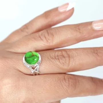 Show more Introducing the **JEWELOPORIUM Copper Green Turquoise Silver Ring**, a stunning piece of jewelry crafted from high-quality **genuine 925 sterling silver**, ensuring a **lifetime of shine** and elegance. This exquisite ring showcases a **10mm round Copper Green Turquoise gemstone**, carefully hand-selected for its rich hues and unique markings. With a **925 stamp** embossed on the band, you can trust its authenticity and quality. Engineered with **anti-tarnish technology**, this ring promises to maintain its beautiful sheen without the worry of premature discoloration. Plus, it’s **lead and nickel-free**, making it perfect for those with sensitive skin, allowing you to wear it comfortably throughout the day. The smooth edges of the design provide a seamless fit, embodying both **stylish sophistication** and **everyday wearability**.