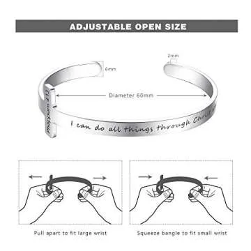 Show moreJewenova Inspirational Cross Bracelet for Women is more than just jewelry; it's a heartfelt sentiment crafted from 316L stainless steel, designed for every woman seeking empowerment and inspiration. This beautifully polished cuff features the empowering message, "I can do all things through Christ who strengthens me", engraved delicately to serve as a constant reminder of faith and resilience. The lightweight design and fully adjustable fit (2.4" inner diameter) make it a comfortable wear on any occasion, ensuring that it not only adorns the wrist but also uplifts the spirit wherever you go.