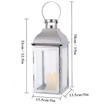 Show more Transform your space into a scene of timeless elegance with the SILVER STAINLESS STEEL CANDLE LANTERN. This life-size vintage candle lantern is not just a functional piece; it is a blend of artistry and charm. Crafted from durable stainless steel and featuring clear tempered glass panes, this lantern captures the essence of old-world allure. The special top design and intricate patterns add a unique aesthetic to this stunning piece, making it an ideal decoration for various settings. Whether you place it on a table, bar, patio, or porch, the graceful marriage of beauty and practicality will undoubtedly catch the eye of your guests.