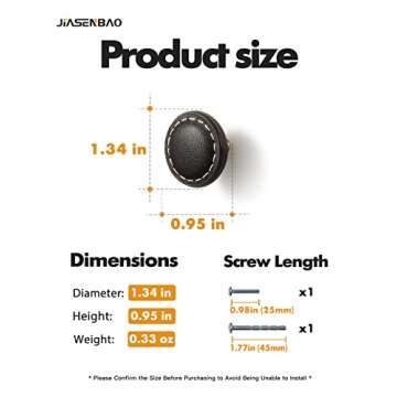 Show moreTransform your space with the stunning JIASENBAO Black Leather Drawer Pulls. Tailored for elegance and functionality, these exquisite round leather handles, crafted from high-quality leather and zinc alloy, embody both sophistication and durability. With their unique design that boasts a prominent surface grain and remarkable texture, they are not just hardware; they are a statement piece meant to elevate the aesthetic of your kitchen, bathroom, and closet. Each handle measures 1.34 inches in diameter and 0.95 inches in height, striking the perfect balance between contemporary style and practical use.