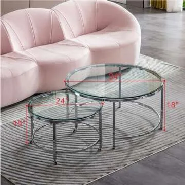 JIEJIEGAO 2 PC Nesting Coffee Table, Round Clear Glass End Tables Set, Sleek Silver Metal Base Side Table, Stylish Snack Table for Living Room, Accent Tea Table for Small Spaces