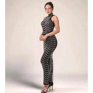 Jigfar Women's Sexy Elegant Rhinestone Sleeveless Complete Mesh See Through Bodycon Maxi Dress(F5259,Black,M)