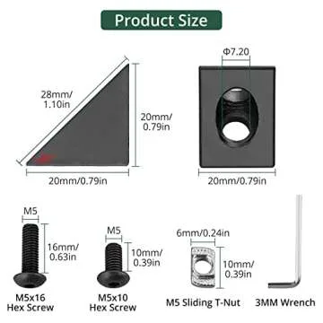 The complete package includes 10 premium triangle corner brackets, 20 M5 set screws, and 20 M5 T-nuts, providing all necessary components for easy installation and assembly. Each piece is designed for compatibility with most metric 20 Series Aluminum Profile Extrusions and European Standard profiles with a slot size of 6mm, ensuring that you can get to work swiftly and efficiently without any hassle.
