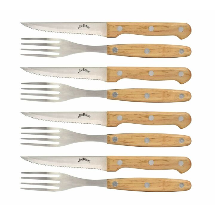 Jim Beam Set of 8 Steak Knives & Forks - Stainless Steel Blade, Light Brown