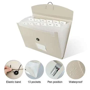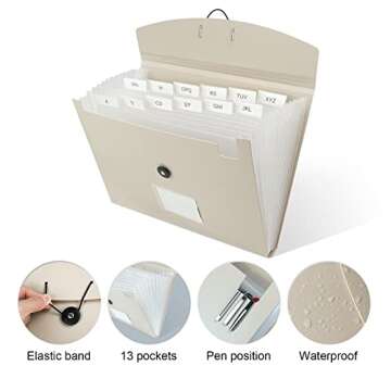 JIMEIQI Accordion File Organizer, 13 Pocket Expanding File Folder Organizer for Letter Size/A4 Documents, Beige Expandable Portable Monthly Bill/Receipt Organizer for Home/Office/School