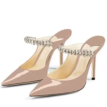 Jimishow Nude Heeled Mules for Women Rhinestone Mule Heels 4” Pointy Closed Toe Slip on Bridal Mule Sandals Size 5