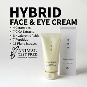 Show more Introducing the JIN JUNG SUNG Sincerity Hybrid Face and Eye Cream, your ultimate all-in-one facial care solution. Formulated to cater to the needs of both face and eyes, this innovative cream boasts a power-packed composition featuring 4 Ceramides, 7 CICA Extracts, 8 Hyaluronic Acids, and 7 Peptides. The unique Micro White' Methodology ensures rapid absorption into the skin, delivering deep hydration without any sticky or greasy residue. This cream stands out in a market flooded with options because it not only hydrates but also rejuvenates aging skin while providing essential protection against UV damage.