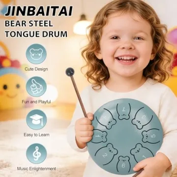Show more Introducing the JINBAITAI Bear Steel Tongue Drum—a delightful 6-inch musical instrument designed to enchant both children and adults alike! This beautifully crafted drum features adorable bear-shaped cutouts that not only captivate young imaginations but also make it an excellent introduction to the world of music. Tuned to a soothing C Major pentatonic scale with 8 resonant notes, this handpan drum ensures that every strike will trigger harmonious melodies, making it impossible to hit a wrong note. Crafted from high-quality carbon steel, it is sturdy yet lightweight, perfect for both indoor and outdoor play.