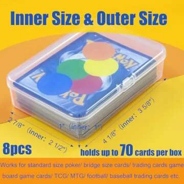 Show moreIntroducing the JINUPHION 8 Pcs Playing Card Case, the ultimate storage solution for all your card game essentials. Each box is meticulously designed with an inner size of 3 5/8" × 2 1/2" × 1", providing ample space to securely house up to 70 standard cards. Whether you're a board game enthusiast, a trading card collector, or someone who enjoys a casual poker night, this versatile card box set is perfect for keeping your cards organized and protected.