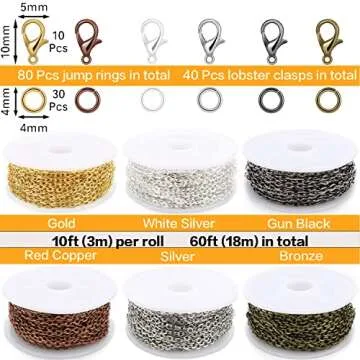Show moreUnleash your creativity with the Jishi Chains Jewelry Making Supplies Kit, a must-have for jewelry enthusiasts and DIY aficionados alike! This comprehensive set includes 60 feet of high-quality cable link chains in six stunning colors: Gold, Silver, Stainless Steel, Red Copper, Bronze, and Gun Black. Each roll measures an impressive 10 feet, giving you ample material to explore and create your own unique accessories. Crafted from premium plated iron, our supplies are free from lead and nickel, ensuring a safe and enjoyable crafting experience for everyone.