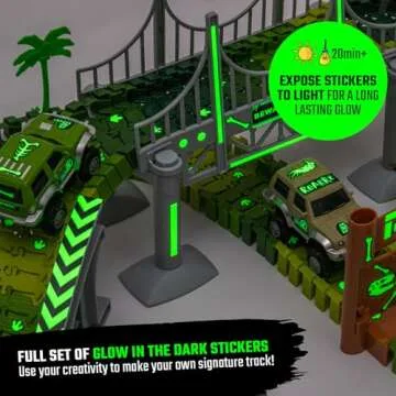 Show more Introducing the JITTERYGIT Dinosaur Jurassic Race Track Train Glow in The Dark World Toy Set! This dynamic and educational playset includes a whopping 144 flexible track pieces that allow your little ones to create their very own custom racetrack! The set features 2 battery-powered electric 4x4 ATV vehicles that zoom through the tracks, ensuring endless fun! With two glow-in-the-dark sticker sheets and various themed stickers, kids can personalize the track and rev up their imagination, whether by day or night.