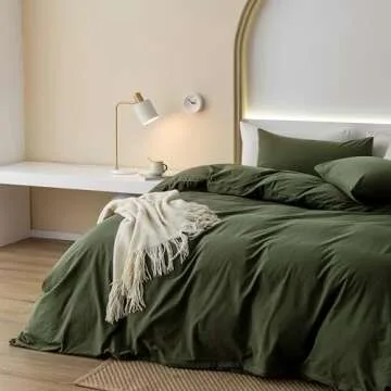 JIYUAN 100% Washed Cotton Duvet Cover Set Comfy Simple Style Soft Breathable Textured Durable Linen Feel Bedding for All Seasons Queen, Solid Olive Green