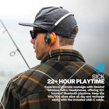 Show more Step back into a world where music and style fuse seamlessly with the JLab Rewind 2 Wireless Retro Headphones. Embrace the nostalgia of classic '80s and '90s design while indulging in modern audio technology that ensures you stay connected and comfortable throughout your listening experience. Crafted for those who appreciate a lightweight feel and eye-catching retro aesthetics, these headphones are fitted with removable foam ear cushions that come in vibrant shades of orange and black, allowing you to customize your look. With an adjustable headband, these headphones provide an excellent fit for extended listening sessions, making them perfect for music lovers everywhere. Enrich your auditory adventure with a whopping 20+ hours of Bluetooth playtime, letting you groove through your playlists without interruption. And when it's time to recharge, just plug in the USB-C charging cable to get back to your favorite tunes in no time!