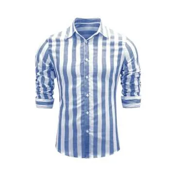 JMIERR Mens Linen Shirt Casual Summer Beach Long Sleeve Button Down Dress Shirt, L, Sky Blue and White Striped