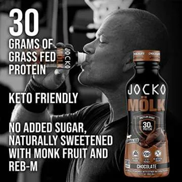 Show more Introducing Jocko Mölk, the ultimate ready-to-drink protein shake designed for those seeking a serious protein boost without compromising on quality. Each 12 FL Oz serving is packed with a potent 30 grams of grass-fed protein, sourced from happy cows, ensuring you get a wholesome blend that fuels your muscle growth and recovery effectively. With 180 calories per serving, this chocolate-flavored delight is not just delicious but perfectly formulated for your daily nutritional needs.