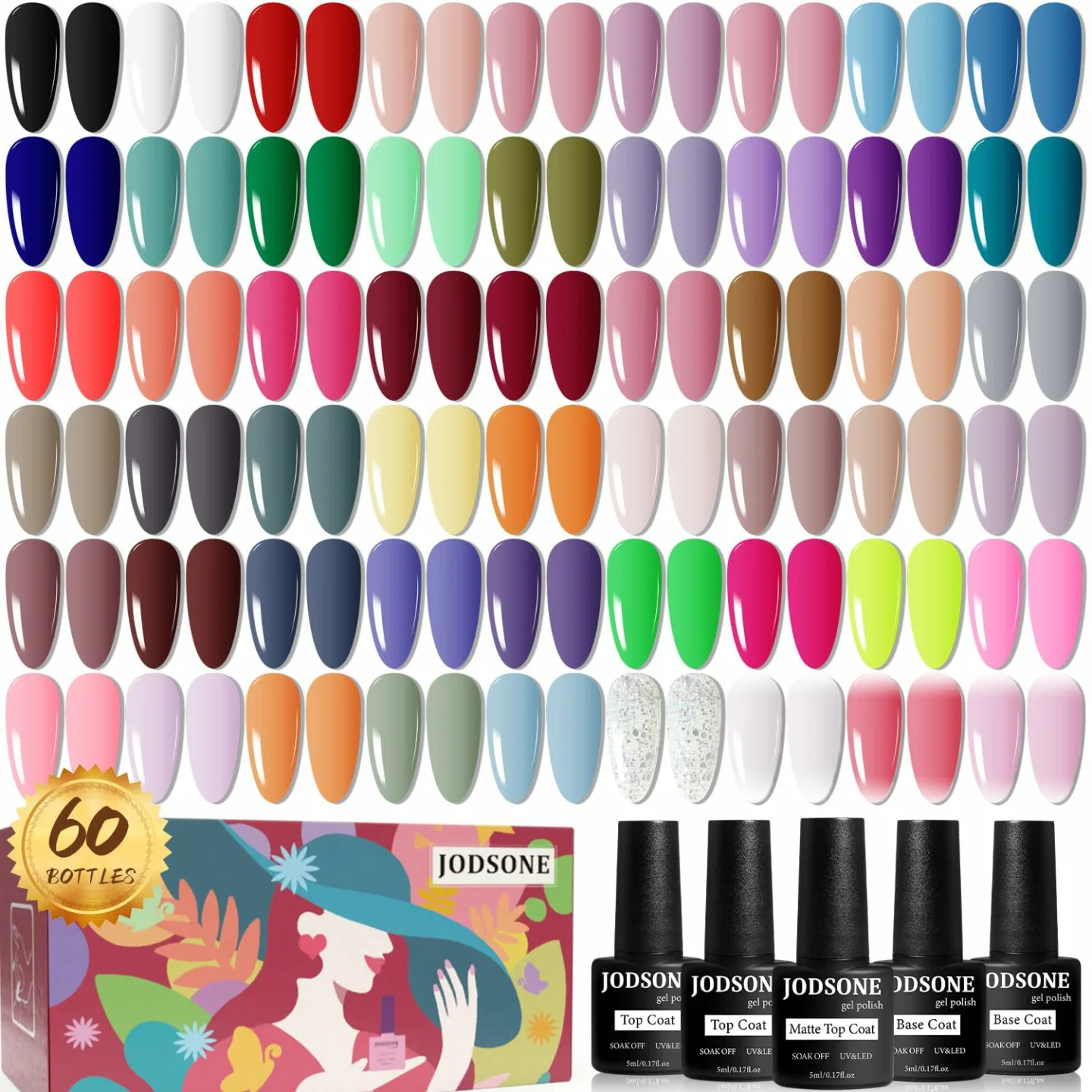 JODSONE 60 PCS Gel Nail Polish Set - All Season Colors with Base & Top Coats