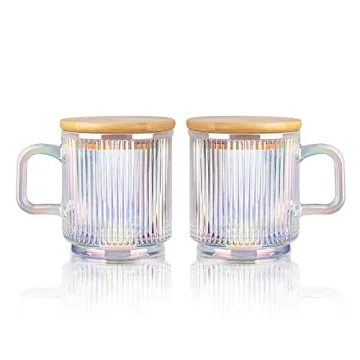 Show more Introducing the Joeyan Iridescent Glass Coffee Mugs Set, where style meets functionality in the most delightful way! Made from premium tempered glass, these mugs radiate elegance with their stunning iridescent finish, perfect for those who cherish unique coffee experiences. The striped embossing sparkles under light, making each sip a magical moment. With a capacity of 11.5 oz (340ml), these mugs are ideal for all your favorite beverages—whether it’s a hot latte, refreshing iced tea, or a cozy cup of moon milk. Their thoughtful design includes comfortable handles that ensure a secure grip while keeping your hands safe from heat.